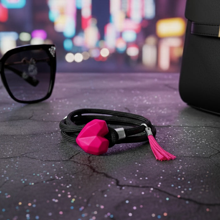PULSERA CORAZON CONCRETO ROSA CORDON NEGRO