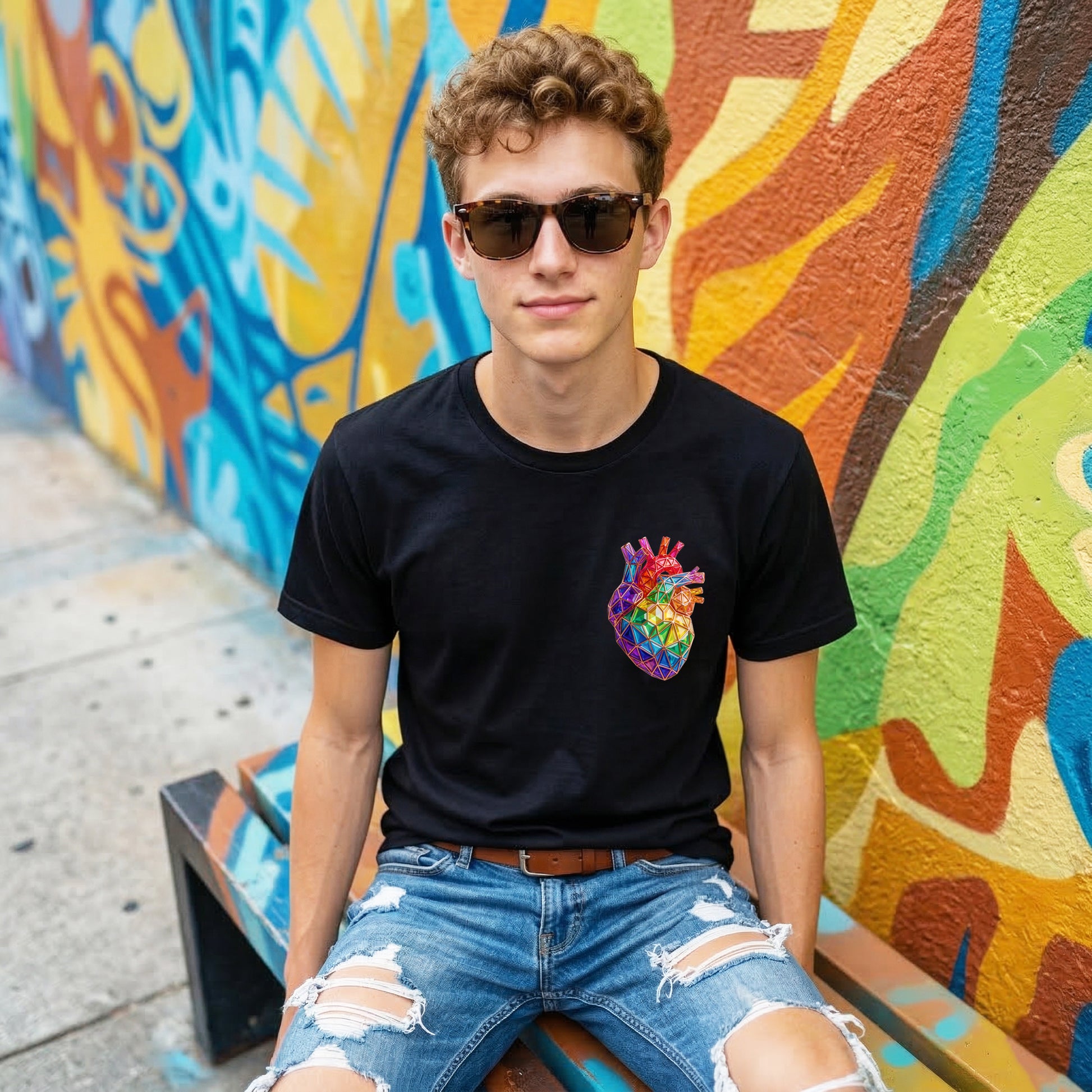 Short-sleeved T-shirt printed with a colorful geometric heart