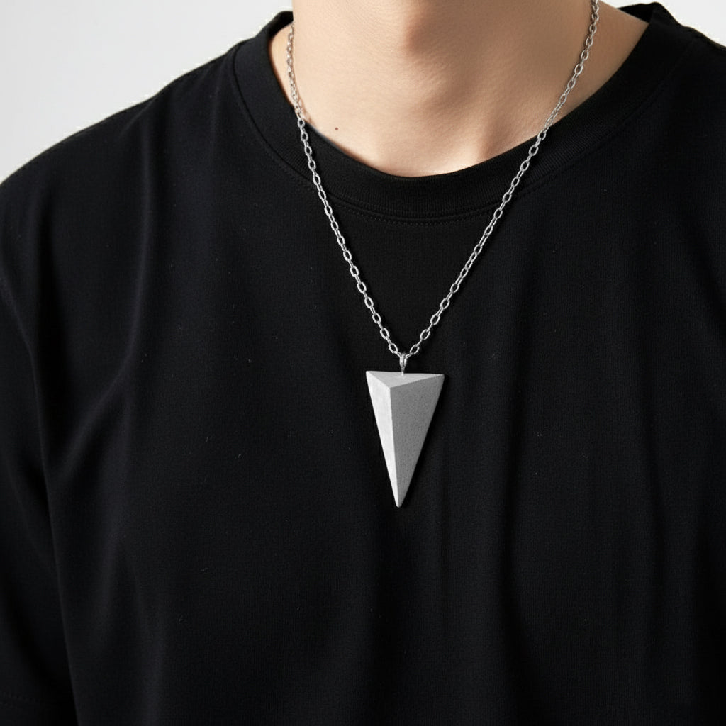 Necklace with a prismatic pendant made of gray concrete by hand.